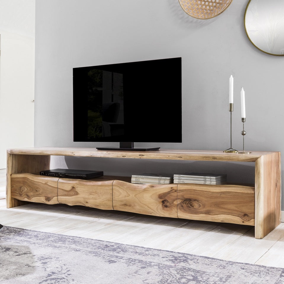 Meuble TV 4 tiroirs 1 niche finition acacia massif avec découpe bord d'arbre L190*P50*H46 cm